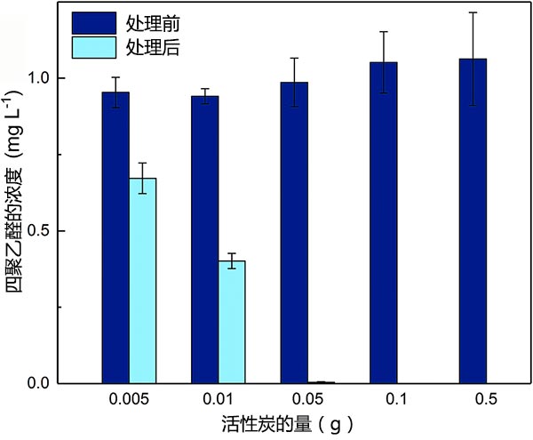 圖2顯示了在不調(diào)節(jié)單一體系中的聚乙醛溶液的pH的情況下處理前后的四聚乙醛濃度?梢钥闯,有效地除去了聚乙醛,特別是在活性炭劑量較高的情況下。單因素統(tǒng)計檢驗證實,在活性炭處理2小時之前和之后,乙醛濃度之間存在顯著差異(p<0.05)。當活性炭用量從0.005g增加到0.05g時,去除甲醛的百分比從30.3%增加到99.6%。當PAC用量高于0.05 g時,處理后未檢測到乙醛,表明其濃度低于檢測到的聚乙醛(1~5μgL-1)。