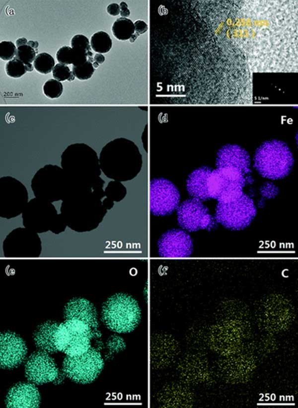 活性炭復(fù)合物的TEM圖像和相應(yīng)的元素分布示于圖5中。如圖,所制備的活性炭均接近球形,粒徑主要集中在約250nm。從圖3(b)中的HR-TEM圖像可以清楚地觀察到單個(gè)Fe 3 O 4納米顆粒的良好晶粒取向,并且該區(qū)域中的SAED圖案也顯示出Fe 3 O 4的結(jié)晶特征。如圖3(c-f)所示,其中可以清楚地觀察到復(fù)合材料由Fe,O和C元素。C的分布區(qū)域明顯大于Fe和O的相應(yīng)區(qū)域,表明鐵納米顆粒分布在活性炭的表面上。因此,結(jié)合XRD,VSM和SEM結(jié)果,我們可以得出結(jié)論,F(xiàn)e 3 O 4 納米顆粒緊密粘附在活性炭的表面上。