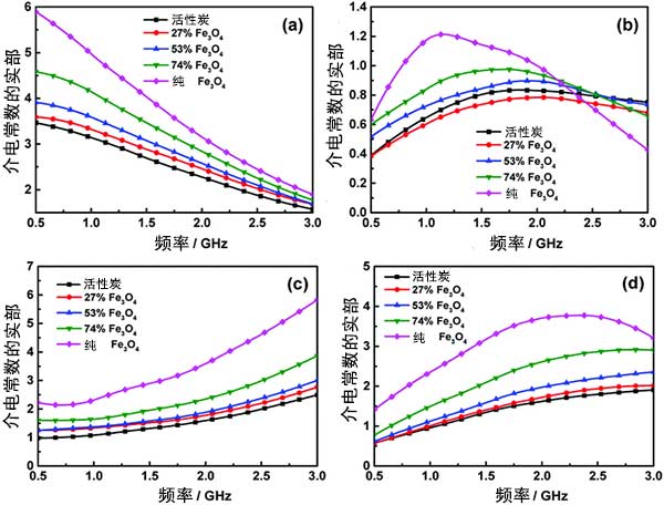 此外,研究了活性炭復(fù)合材料的電磁波吸收性能。圖4顯示復(fù)介電常數(shù)和導(dǎo)磁率,這些電磁參數(shù)對于確定微波吸收復(fù)合材料的介電和磁損耗非常重要,并且在吸收過程中電磁波的傳輸和反射也受它們的影響。從圖6(a)和(b)中,可以觀察到,所有樣品的介電常數(shù)的實(shí)部與增加頻率。圖6(c)和(d)顯示了磁導(dǎo)率的實(shí)部和虛部作為頻率的函數(shù)。觀察到當(dāng)活性炭的負(fù)載量低時(shí),滲透率的實(shí)部僅略微增加。