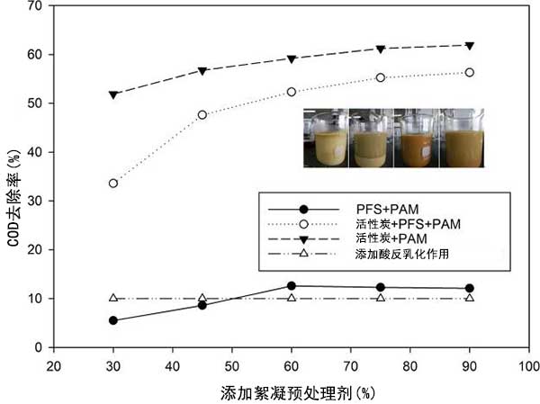 凝結(jié)劑的組合有效地降低了油滴之間的靜電排斥并加強(qiáng)了油和水的分離。凝結(jié)劑的一些組合可以改變油滴上的電荷,產(chǎn)生再穩(wěn)定化或膠體凝結(jié)劑現(xiàn)象,導(dǎo)致切削液COD穩(wěn)定或增加。實(shí)驗(yàn)結(jié)果的分析表明,活性炭+PAM的處理效果比較好。