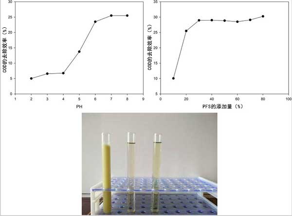 在活性炭負(fù)載鐵離子的初級(jí)絮凝預(yù)處理后,濾液含有少量雜質(zhì)。研究了PFS絮凝劑對(duì)過濾廢物的影響。使用單因素實(shí)驗(yàn)選擇pH值和PFS添加量(圖3a,b)。原始溶液與初級(jí)和次級(jí)絮凝后的溶液的視覺比較顯示在圖3c中。