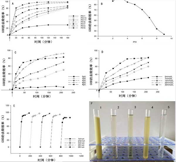 圖4中(a)pH對(duì)使用活性炭去除COD的速率的影響,(b)pH對(duì)使用傳統(tǒng)方法去除COD的速率的影響,(c)活性炭添加對(duì)去除COD的影響,(d)添加H 2 O 2對(duì)COD去除率的影響,(e)活性炭在多次運(yùn)行中的性能,(f)實(shí)物圖片中(1)未處理的切削液,(2)初次絮凝后的混合物,(3)二次絮凝后的混合物,(4)傳統(tǒng)處理后的混合物,和(5)活性炭處理后的混合物。