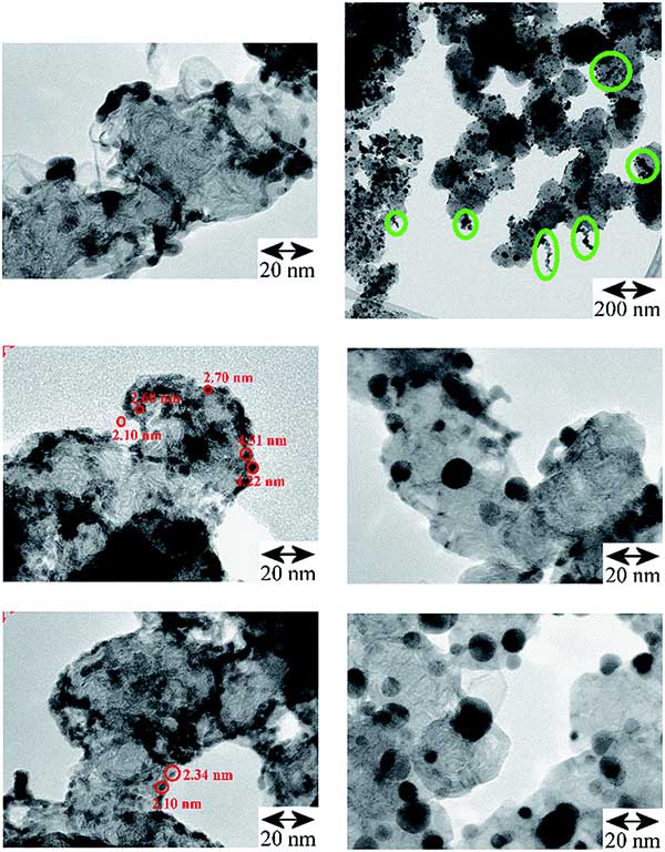 活性炭負(fù)載鈀催化劑的TEM比較顯示在圖1。左:原始活性炭,右頂部和中部:在300°C和底部:400°C下進(jìn)行碳熱處理后,這會導(dǎo)致活性炭的顆粒增長,但之后聚集體大部分缺失孤立的較大平均尺寸增大的鈀微晶留在活性炭表面。右上:在300℃處理后的活性炭負(fù)載鈀的調(diào)查圖像,其中的橢圓形綠色標(biāo)記突出顯示在400℃催化劑上不存在的殘余聚集體。顯示貴金屬實(shí)體的形狀,尺寸和形態(tài)之間的明顯差異。對于活性炭負(fù)載鈀,在多孔高表面積活性炭載體上/中存在大部分分離的初級顆粒。對于活性炭催化劑,主要存在線性聚集鏈和支化聚集體,在表面具有一些聚集體。熱處理導(dǎo)致大部分分離的初級顆粒尺寸增大,僅剩下少量聚集體或附聚物。