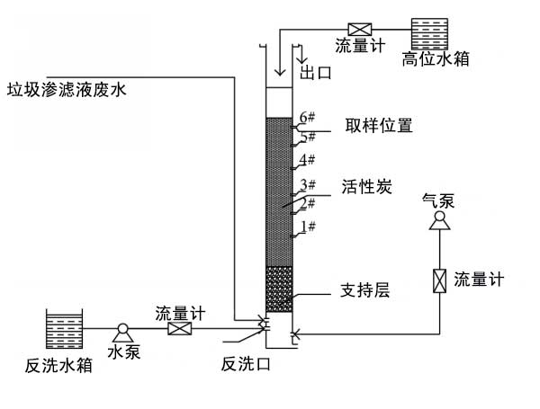 活性炭反應器工藝流程圖如圖1所示;钚蕴砍赜捎袡C玻璃制成,有機玻璃是柱式反應器;钚蕴砍馗叨葹2米。內(nèi)徑為63毫米。填充高度為1800毫米。碳層高度為1500毫米。砂濾器高度為300毫米。反應體積為4.7 L.有5個水取樣口和碳池。底部有曝氣器,碳池頂部有溢流堰。水質分析指標為紫外分光光度法和紫外分光光度計。