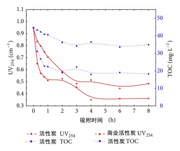 根據(jù)圖4,活性炭表現(xiàn)出良好的吸附生化水的性質。UV254和TOC的濃度具有類似的變化趨勢。UV254和TOC的去除效率分別為63.0%和59.7%。商業(yè)活性炭的吸附性能較弱。UV254和TOC的去除率僅為52.9%和24.8%。商業(yè)活性炭的孔體積小于活性炭的孔體積。圖4中活性炭的UV254去除曲線分為兩個階段,它們分別對應于膜擴散和粒子擴散。