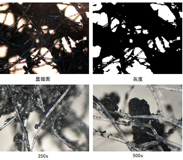 圖1:活性炭負(fù)載無(wú)紡布樣品的原始光學(xué)顯微鏡圖像與灰度表示。