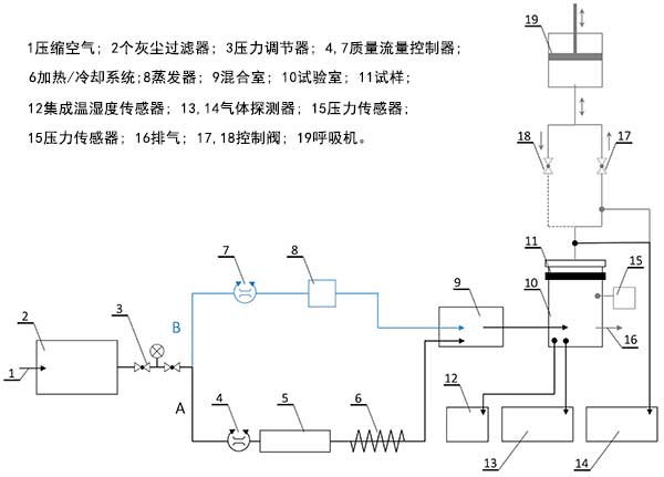 使用環(huán)己烷蒸氣作為被吸附物質(zhì)在圖2中所示的試驗(yàn)臺(tái)上進(jìn)行突破性實(shí)驗(yàn)。選擇環(huán)己烷進(jìn)行實(shí)驗(yàn),因?yàn)樗菧y(cè)試標(biāo)準(zhǔn)中特性比較全面的。此外,測(cè)試設(shè)置如圖2所示由于這種情況,優(yōu)化了使用環(huán)己烷作為測(cè)試物質(zhì)。環(huán)己烷是這類物質(zhì)的良好代表,因?yàn)樗欠菢O性和非反應(yīng)性的,因此應(yīng)主要通過(guò)物理吸附與活性炭表面結(jié)合。此外,它是在工業(yè)過(guò)程中大量使用的化合物之一,因此它經(jīng)常存在于工作環(huán)境中。