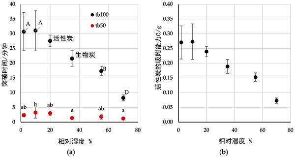 圖4:相對(duì)濕度對(duì)(a)校正突破時(shí)間和(b)吸附能力的影響。