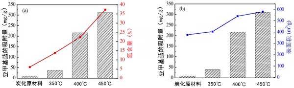 活性炭的空氣活化產(chǎn)生更多的分層孔結(jié)構(gòu),具有更高的表面積和更豐富的表面官能團(tuán)。更多數(shù)量的孔納米結(jié)構(gòu)可為染料分子提供大量吸附位點(diǎn)并改善其吸附能力。富含表面的官能團(tuán)可促進(jìn)活性炭在水中的分散,使活性炭在吸附過程中與染料完全接觸。這些性質(zhì)在空氣活化后賦予活性炭較好的亞甲基藍(lán)吸附性。在300℃至450℃的溫度下空氣活化后,盡管由于350℃活化導(dǎo)致的表面積略微增,但吸附容量是炭化原料的4.8倍。這種情況表明,表面積在提高空氣活化后活性炭的吸附能力方面起著次要作用。表面性質(zhì)的變化可能主要影響空氣活化后活性炭的吸附性能。結(jié)果得到了亞甲基藍(lán)吸附容量與受空氣活化溫度影響的活性炭表面積和氧含量的相關(guān)性的支持(圖7)。亞甲基藍(lán)的改善的吸附性能與與活化溫度相關(guān)的氧含量的變化趨勢很好地對(duì)應(yīng)(圖7a)。而隨著活化溫度的升高,吸附容量的增長率遠(yuǎn)高于表面積(圖4b)。