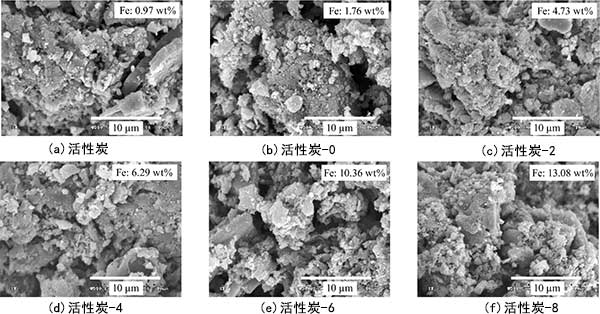 載鐵活性炭的SEM照片如圖1所示。載鐵活性炭具有片狀石墨填充結(jié)構(gòu)的表面形態(tài),其顯示產(chǎn)生大量微孔。對于所有活性炭,觀察到小的聚集體,其看起來更亮并且在活性炭的較暗表面上得到支撐。細氧化鐵顆粒傾向于覆蓋活性炭的表面而不是均勻地分散在整個表面上。作為四氧化三鐵的添加量增加,活性炭表面的聚集增加。通過能量分散X射線(EDX)分析(未顯示),證實聚集體是含鐵化合物。樣品的鐵含量顯示在圖1中每張圖的右上角。