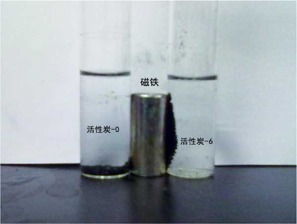 與不含鐵的活性炭相比,在四氧化三鐵存在下制備的磁性活性炭的矯頑力和剩磁有顯著影響。矯頑力和剩磁的低值接近于零表明活性炭在室溫下表現(xiàn)出超順磁性;钚蕴康某槾判袨槭蛊涓菀妆淮盆F或磁場分開。同時,低剩磁在活性炭與原始解決方案分離后,大大減少了活性炭的聚集。使用磁鐵的簡單分離試驗的結(jié)果如圖4所示。