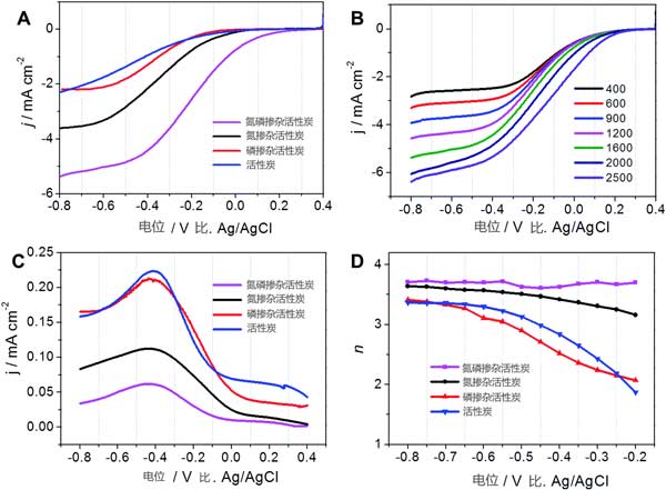 活性炭樣品通過兩步法制備,包括原位氧化聚合和高溫?zé)峤。這里,苯胺和植酸分別用作氮源和磷源。為了研究氮磷碳比對(duì)活性炭的氧化還原電催化活性的影響,在中性介質(zhì)中進(jìn)行循環(huán)伏安圖。旋轉(zhuǎn)圓盤電極伏安圖在氧飽和的50mM磷酸鹽緩沖溶液中進(jìn)行,結(jié)果顯示在圖2A中。在摻雜碳改性后,活性炭基催化劑的起始電位顯示出從0V到+0.22V的大的正向偏移,氧化還原電流密度也大大增加。此外,由共摻雜碳改性的活性炭電催化活性優(yōu)于由單摻雜碳改性的活性炭電催化活性。在進(jìn)行旋轉(zhuǎn)環(huán)盤電極測(cè)量以研究不同催化劑的過氧化氫的產(chǎn)生(圖2C)。正如預(yù)期的那樣,氮磷摻雜活性炭顯示出比其他催化劑更低的過氧化氫產(chǎn)生?梢钥闯,氮磷摻雜活性炭在氧化還原起始電位和高電流電流方面對(duì)氧化還原具有優(yōu)異的電催化活性,突出了N,P共摻雜和中孔結(jié)構(gòu)對(duì)氧化還原的重要性。