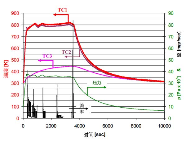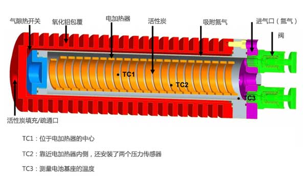 排出壓力約為3.5MPa的實驗結(jié)果如圖4所示。250秒后,加熱功率為500W,中心溫度超過476℃,而電池底座溫度則為76℃。然而,將電池達(dá)到其穩(wěn)態(tài)溫度分布需要大約60分鐘,其中電池基座中的溫度為166℃;钚蕴康臏囟炔辉试S超過526℃。 60分鐘,加熱功率逐漸降低,以保持最高溫度低于526℃,壓力高于3.5MPa。由于電池基座的溫升速率隨時間降低,輸送的氮量也減少了。因此,在15分鐘后結(jié)束放電階段僅從活性炭吸附池釋放4.6g氮。圖4中的冷卻階段持續(xù)約100分鐘,并且如果放電階段在15分鐘后結(jié)束(此時基礎(chǔ)溫度僅為126℃),則可以減少冷卻階段;钚蕴恐械募訜岷屠鋮s速率以及溫度分布與數(shù)值分析估計的相似。這表明簡化的數(shù)值傳熱分析為吸附池中的傳熱提供了令人滿意的估計。