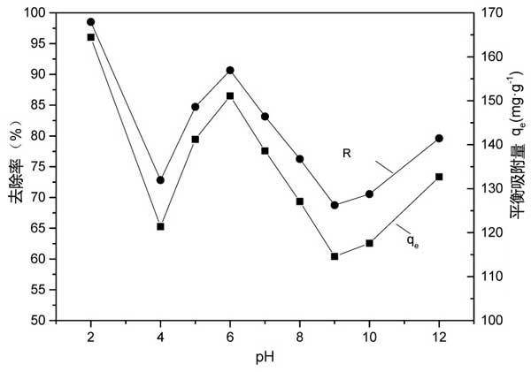 pH對(duì)活性炭吸附鉻黑T的影響:用3.00g·L-1活性炭懸浮于含有500mg·L-1鉻黑T的50mL溶液的8個(gè)燒杯中進(jìn)行pH效應(yīng)實(shí)驗(yàn),pH設(shè)定為2.0-12.0。將混合物在25℃的溫度下在振蕩器上平衡48小時(shí)。吸附后,用孔徑為0.45μm的聚醚砜膜過(guò)濾混合物,測(cè)定鉻黑T水溶液濃度。根據(jù)結(jié)果,我們確定了合適的pH值。
