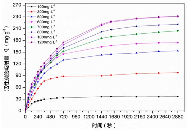 初始鉻黑T濃度對(duì)活性炭吸附的影響:用一系列鉻黑T水溶液(濃度:100.0-1200.0mg·L-1,體積:50mL)進(jìn)行初始鉻黑T濃度效應(yīng)實(shí)驗(yàn)。將溶液的pH調(diào)節(jié)至合適,然后將溶液加入3.00g·L-1活性炭中,并將混合物在25℃的溫度下在振蕩器上平衡48小時(shí),定期取水樣,測(cè)量鉻黑T水溶液的濃度,并計(jì)算吸附的鉻黑T量。