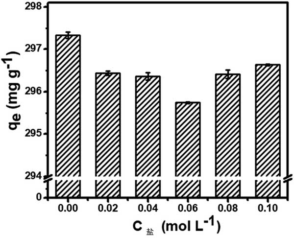 染料廢水含有各種鹽類和金屬離子,影響活性炭的吸附效率。在圖2中可以觀察到孔雀石綠對活性炭的吸附能力受鹽濃度的顯著影響。當(dāng)NaCl濃度為0.02mol L-1時,吸附容量意外降低。然而,在將鹽濃度增加到0.10mol L-1的同時,這種負面影響將變得可以忽略不計。如上所述,靜電相互作用可能在吸附過程中起關(guān)鍵作用。