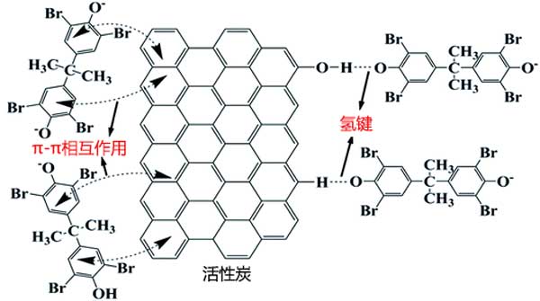 根據(jù)先前研究的多種吸附動力,包括靜電相互作用,氫鍵,π-π相互作用,疏水效應等;谶@些結(jié)果,進一步提出了四溴雙酚A在活性炭表面上的可能吸附過程(圖4)。由此可以推斷,由于苯環(huán)和活性炭表面上的-OH基團,π-π相互作用可能在吸附過程中起重要作用,因為給電子官能團可能增強四溴雙酚A芳環(huán)的π-給體強度。氫鍵也對吸附產(chǎn)生顯著影響,活性炭可作為氫鍵供體,依賴于-OH基團和表面上的芳環(huán),產(chǎn)生更好的吸附能力。此外,根據(jù)動力學模型分析的結(jié)果,吸附劑和吸附物之間可能存在電子交換或共價鍵。