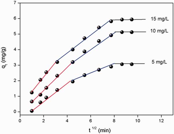 圖2:龍膽紫染料吸附到活性炭上的顆粒內(nèi)擴(kuò)散模型。