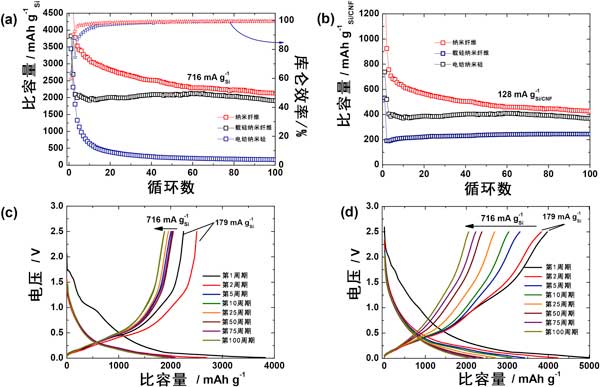 如圖4所示,從第一個循環(huán)的電壓分布中看出,兩個陽極的第一個循環(huán)的額外貢獻來自不可逆的固體電解質界面層形成和電解質分解。對于電化學表征,在紐扣電池配置中使用鋰金屬作為對電極對所有硅陽極進行恒電流充電和放電。裸露的十億分之一硅陽極在第一個循環(huán)中提供3445mAhg的放電容量,庫侖效率約為65%。從第二個循環(huán)開始,二氧化硅的硅載納米纖維陰極的比容量值急劇下降至2600mAhg,而納米纖維的靜電紡絲陽極顯示出邊際下降,比容量為4000mAhg-1,庫侖效率均為約91%。比容量的急劇下降可歸因于二氧化硅的硅載納米纖維中的二氧化硅殼在第一次循環(huán)中不可逆鋰化。
