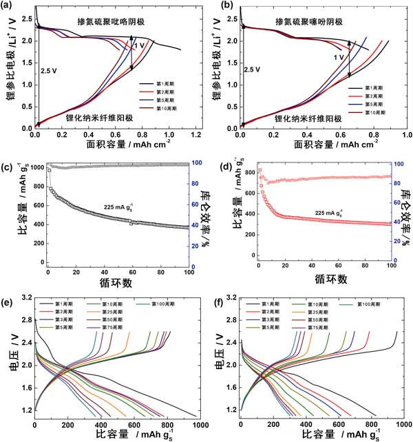 為了證明設計單個電極的可行性和相關性,用鋰化硅/納米纖維陽極代替金屬鋰以實現0.鋰-硅/硫全電池。為此目的,陰極和陽極都應在半電池測試中實際實現的面積容量方面進行平衡。在全電池配置中,硅陽極的脫鋰與硫陰極的鋰化密切相關。換句話說,硫陰極的放電將遵循硅陽極脫鋰的潛在和容量分布。