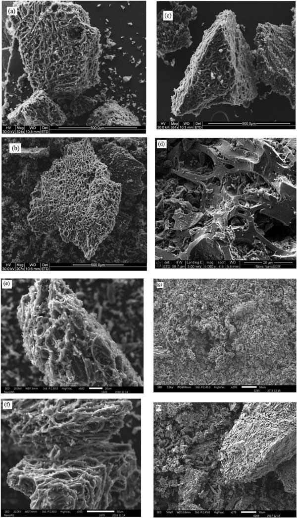 掃描電子顯微鏡圖像顯示在圖1a-h中;钚蕴康牧姿崽幚韺(dǎo)致具有可見孔隙率的材料(圖1a-c)。然而,仔細(xì)觀察后,孔隙結(jié)構(gòu)和尺寸是不同的。20%濃度改性后的活性炭具有稍微細(xì)長的孔,40%表現(xiàn)出均勻的圓形孔,而60%顯示出細(xì)長和圓形毛孔的混合。這些觀察結(jié)果表明,不同濃度的磷酸活化的活性炭具有不同的物理屬性。在這種情況下,磷酸是活化劑,并且在加熱時(shí)產(chǎn)生孔道,因?yàn)樗鼜奶贾幸莩,從而帶走一些萃取劑。圖1d描繪了具有小孔的粗糙紋理,圖1e顯示了類似巢的類型的孔,圖1f顯示了孔的破壞和變寬?捉Y(jié)構(gòu)和孔體積的變化可歸因于活化劑的強(qiáng)度增加。濃度較高的硝酸會(huì)破壞表面基團(tuán)。因此,需要使用最佳濃度的活化劑來防止損害吸附劑的表面特性。濃度太高可能導(dǎo)致結(jié)合官能團(tuán)的提取,使吸附劑吸附性差。