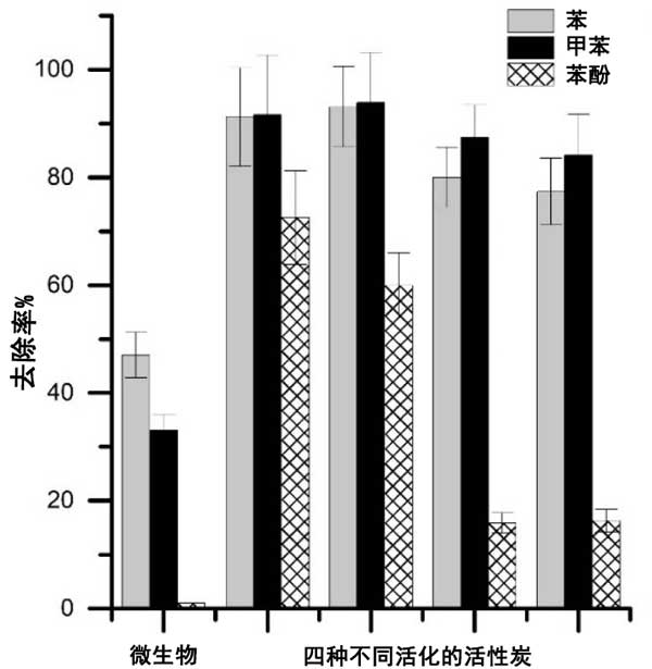 簡(jiǎn)而言之,使用活性炭(60%-93%)和載微生物活性炭(16%-84%)比游離的無活性炭載體的微生物(1%-47%)更好地去除芳香烴。材料的孔隙率和吸附偶極性有利于吸附。常規(guī)活性炭表現(xiàn)出高度的微孔性,其中可以容納分子量約為100的苯,甲苯和苯酚;钚蕴康姆菢O性特征保證了碳?xì)浠衔锏氖杷,也是非極性的;钚蕴筷栯x子表面有利于芳烴保留,因?yàn)榉辑h(huán)中的π電子與表面陽離子靜電連接。使用常規(guī)活性炭和載微生物活性炭的原油去除能力如圖3所示。使用游離的微生物和油-鹽水乳液作為對(duì)照。