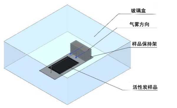 活性炭關(guān)于電場附增強吸附測試設(shè)備,由一個樣品架組成,樣品架放置在一個33厘米×33厘米×12厘米的帶有硼硅酸鹽玻璃壁的盒子內(nèi)(圖3)。風扇(位于偏轉(zhuǎn)板后面)引起平行的空氣通量到樣品。在細的(直徑為180 µm)鎢絲電極(放電電極)上施加正電勢,而相對電極(活性炭)通過兩端的兩個接地連接接地。