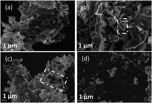 圖2:在其他標準條件下以20 kV放大倍數(shù)拍攝的碳沉積(a)0.15,(b)0.30,(c)0.60和(d)1.20 A cm-2時拍攝的SEM圖像。