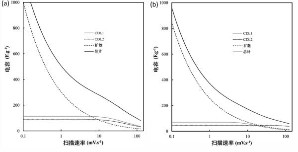 圖4:掃描速率對(a)以活性炭和其他標準條件以及(b)活性炭對總電容的貢獻的影響。C D表示由于擴散引起的電容,而C DL1和C DL2分別表示與納米和微孔表面積以及外部碳表面積相關(guān)的雙層。