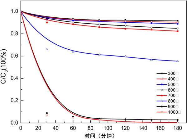圖2:不同煅燒溫度下活性炭對(duì)的苯酚降解效率。