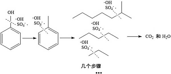 圖4顯示了苯酚的降解過程。首先破壞連接苯酚中羥基的化學(xué)鍵,然后打開苯環(huán)以形成通過單鍵連接的單鏈。隨著反應(yīng)的進(jìn)行,單鏈之間的化學(xué)鍵被破壞,并形成具有較少碳原子數(shù)的單鏈。將鏈重組為新的長鏈的過程是由于氧化劑劑量不足。然而,隨著反應(yīng)的進(jìn)行,諸如這些短鏈和新形成的長鏈的中間體被進(jìn)一步降解。在此過程中,一些單鏈會(huì)隨著反應(yīng)時(shí)間的增加而重組形成一條更長的新單鏈。隨著這一過程的繼續(xù),長單鏈逐漸分解成短鏈,然后苯酚礦化成二氧化碳和水。