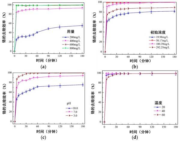 如在示出的圖4中的a,b中,活性炭中的nZVI劑量和初始濃度對總鉻的去除動(dòng)力學(xué)顯著影響。初始去除率隨著活性炭復(fù)合材料劑量的增加或初始濃度的降低而逐漸增加,因?yàn)樘峁┝俗銐虻膎ZVI活性位與鉻反應(yīng)。