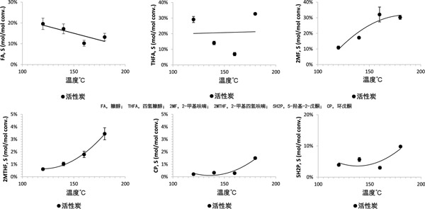 由于使用活性炭整料進行糠醛連續(xù)氫化以合成糠醇,四氫糠醇和環(huán)戊酮的工作很少,我們希望確定溫度和壓力對選擇性和時空產(chǎn)率或轉化率的影響。因此,在一組實驗中,采用活性炭催化劑來確定溫度對糠醛氫化的影響。在所有溫度下,活性炭整料的糠醛轉化率均高于90%。活性炭整料的高碳封閉率是在180°C時達到的(約90%)。升高溫度會降低糠醇的選擇性,并提高除四氫糠醇以外的所有產(chǎn)品的選擇性(圖2)。