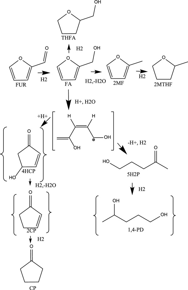 在下一組實驗中,確定了液體停留時間對糠醛加氫超過0.8%活性炭催化劑的影響(H 2氣流保持恒定在100 mL/min)?啡┺D化率隨著液時空速的增加或停留時間的縮短而下降,碳封閉率在74%至100%之間。溫度,壓力和液體停留時間效應研究的結果表明,活性炭催化劑主要通過糠醛促進了糠醛中糠醇和2-甲基呋喃的形成,并通過推測性反應途徑促進了環(huán)戊酮和5-羥基-2-戊酮的少量形成,需要對酮進行酸催化)形成(圖3)。