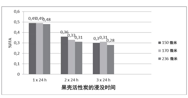圖1:椰殼活性炭FFA數(shù)與粒徑和浸沒時(shí)間的關(guān)系。