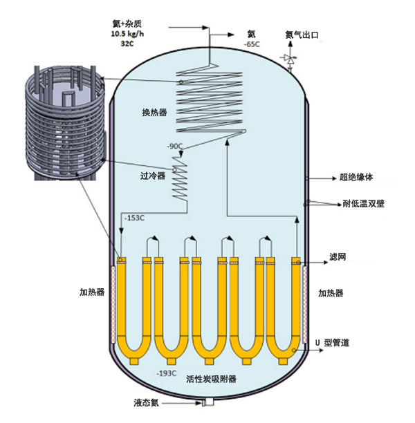 低溫單元是一系列熱交換器,稱為冷阱和活性炭吸附柱,它們浸入裝有液氮的容器中。該系列熱交換器是氦氦換熱器(HE的管中管類型)。過冷器將氦氣溫度降低至-153°C。吸附器將一根裝有活性炭的U型管立柱。如圖2所示,在色譜柱周圍安裝了一個電加熱器以進行再生。低溫容器是雙壁容器,其中壁之間的間隙中充滿了超絕熱材料。該容器裝有液氮,并將吸附過程保持在低溫(±180°C)下。