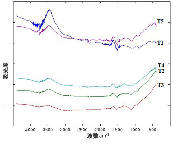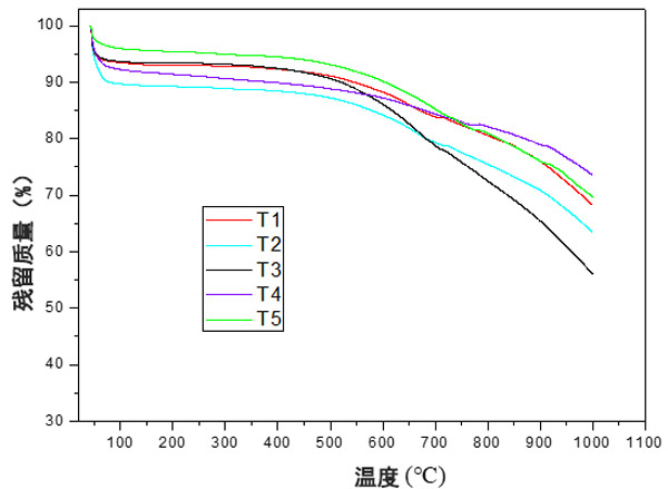 根據(jù)圖3,不同的處理導(dǎo)致熱分解曲線有所不同。此外,不同處理的殘留質(zhì)量也有所不同,處理T1,T4和T5呈現(xiàn)更高的殘留質(zhì)量,表明這些處理具有更高的耐熱性。處理T2和T3的殘留量較低,表明處理的耐熱性較低。此外,這些處理在后期殘留質(zhì)量之間存在重大差異而脫穎而出。根據(jù)處理(電擊時間),降解曲線的差異可能與表面上不同官能團(tuán)的存在有關(guān)。在熱過程中,由于存在的官能團(tuán),會形成不同的產(chǎn)物,從而導(dǎo)致更高或更低的質(zhì)量損失,因?yàn)榛钚蕴康臒岱纸夥磻?yīng)了其表面上官能團(tuán)的存在。然后,官能團(tuán)的類型和數(shù)量都會影響熱重曲線。但是,由于表面官能團(tuán)的降解與其結(jié)構(gòu)不同,因此官能團(tuán)的類型具有更大的影響,并且可以解釋處理之間的差異。