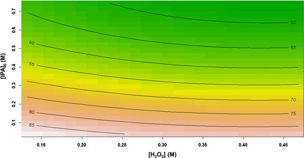 圖2顯示了總有機(jī)碳去除效率百分?jǐn)?shù)與H 2 O 2濃度和初始異丙醇濃度的關(guān)系。從響應(yīng)輪廓中可以看出,將異丙醇初始濃度從0.038 M增加到0.743 M,導(dǎo)致TOC去除率從85.17%急劇降低到46.29%?赡苁且?yàn)樵谙嗤膽?yīng)用反應(yīng)條件下,自由基(OH•)的數(shù)量保持恒定,而初始異丙醇濃度卻增加了。換句話說,相對較少量的氧化基團(tuán)可用于攻擊異丙醇分子。類似地,總有機(jī)碳降解性能也隨著H 2 O 2濃度的增加而逐漸降低。過量的H 2 O 2可能促進(jìn)自動(dòng)清除反應(yīng)的發(fā)生。