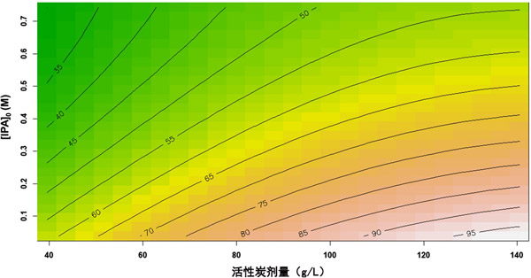 圖2:過氧化氫濃度和初始異丙醇濃度的相互作用效應(yīng)及其對總有機(jī)碳去除率的影響;钚蕴康膭┝勘3趾愣ㄔ90 g/L。