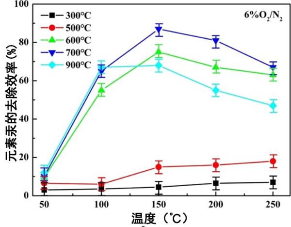 對(duì)于活性炭吸附煙氣中的元素汞。除汞測(cè)試表明,熱解溫度為700°C時(shí),活性炭的除汞效率為86%。氧氣的存在促進(jìn)了元素汞的去除。當(dāng)熱解溫度升至900°C時(shí),活性炭趨于團(tuán)聚,導(dǎo)致結(jié)晶相粒徑急劇增加,從而抑制了元素汞的去除。但在更高的熱解溫度下會(huì)增加;钚蕴康腂ET表面非常差,當(dāng)熱解溫度不高于500°C時(shí),幾乎不會(huì)產(chǎn)生鈷元素,導(dǎo)致除汞效率低。無論如何,活性炭可以用于吸附去除元素汞,而不是通過化學(xué)改性添加鈷,從而可以在燃煤煙氣中去除汞。