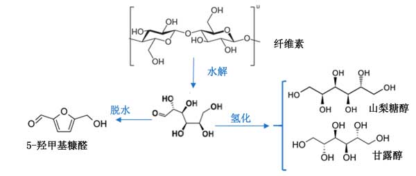 從纖維素中所示產(chǎn)物的反應(yīng)途徑的簡(jiǎn)化方案在圖2展示。在空白試驗(yàn)(無催化劑)中,纖維素轉(zhuǎn)化率為35%,并且形成了少量的葡萄糖和羥甲基糠醛。在用活性炭負(fù)載的釕催化劑進(jìn)行的測(cè)試中,與空白實(shí)驗(yàn)相比,纖維素轉(zhuǎn)化率顯著提高,并且山梨糖醇收率很高。這些數(shù)據(jù)中的實(shí)驗(yàn)誤差低于5%。