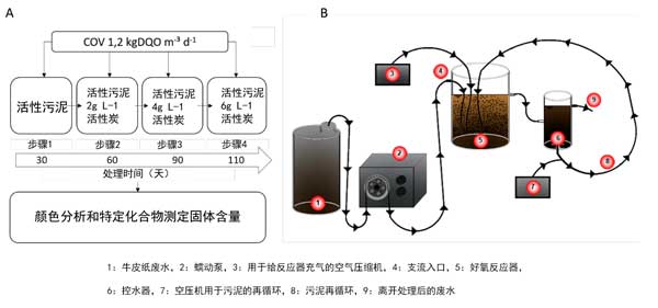 圖1:(A)實(shí)驗(yàn)方法流程圖,(B)用粉狀活性炭活化的污泥系統(tǒng)。