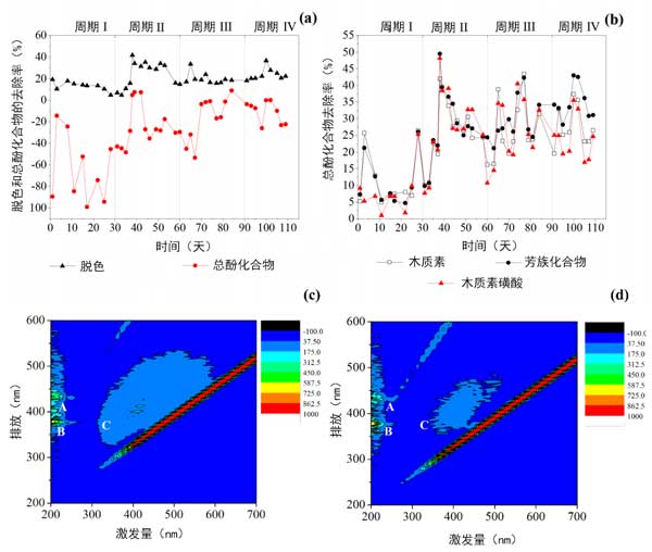 圖2:(a)去除顏色和總酚類化合物。(b)去除木質(zhì)素,芳族化合物和木質(zhì)素磺酸化合物。(c)富集的熒光發(fā)射和激發(fā)矩陣。(d)廢水排放和熒光激發(fā)矩陣。