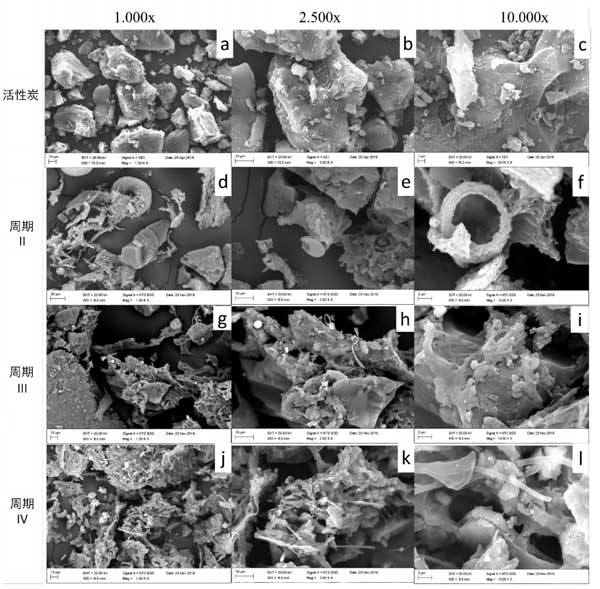 觀察圖3所示的圖像,處理期間生物量顯著增加,其中存在大量生物材料,可能的絲狀形成和微生物團(tuán)聚,表明存在較大量步驟IV中的生物量。至于生物膜的發(fā)展,觀察顯微照片增加了10,000倍(圖3C,3I和3L),注意到附著在活性炭表面的微生物的生長(zhǎng)。這些可能是細(xì)菌,真菌和絲狀細(xì)菌,活性炭在反應(yīng)器運(yùn)行110天后,固體樣品中的細(xì)菌含量更高。
