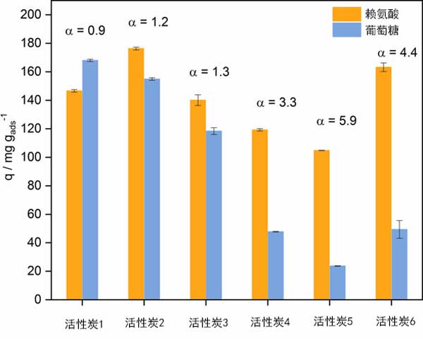 重要的是要了解吸附過程的選擇性,因為賴氨酸是通過葡萄糖的發(fā)酵以工業(yè)規(guī)模生產的,并且存在不同成分的混合物。作為模型溶液,使用了等效質量的賴氨酸和d-葡萄糖的混合物。保持濃度低于單模型溶液的濃度,以抑制不希望的反應。圖2顯示了活性炭的競爭性吸附性能。 單組分吸附對賴氨酸的吸附能力相對較高,而與活性炭的各自特性無關。在多組分吸附中,考慮到吸附的選擇性,活性炭表面性能的影響變得更加明顯。發(fā)現選擇性與表面氧基團的數量相關,因為較高的氧基團轉化為對賴氨酸的較高的選擇。