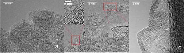 選擇了三種活性炭,代表三種不同的孔幾何形狀,同時保留了化學(xué)均一的吸附表面和可比較的孔徑。選定的樣品是由隨機(jī)排列的石墨層組成的活性炭,具有狹縫孔幾何形狀的碳化鈦衍活性炭和具有圓柱孔幾何形狀的活性炭納米管樣品。對活性炭納米管進(jìn)行熱處理,以去除端蓋,并使氣體進(jìn)入內(nèi)部孔隙。選擇加熱條件以將活性炭納米管的開孔率和BET表面積調(diào)整到與其他兩個碳樣品相當(dāng)?shù)乃,同時還清潔表面并去除雜質(zhì)。所有三個樣品的特征如下:使用透射電子顯微鏡(TEM)圖1證明了這些材料的孔幾何形狀的差異。