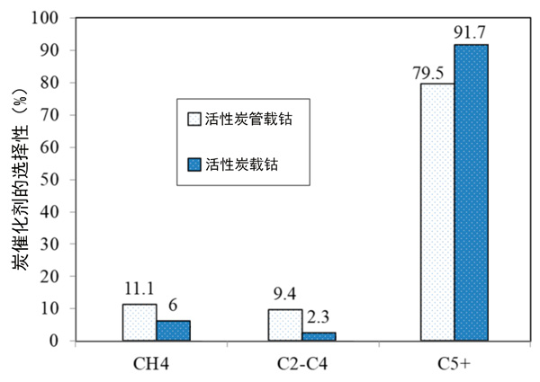 費(fèi)托合成試驗(yàn)是在210℃和2.5MPa的內(nèi)徑為12mm的不銹鋼固定床管式反應(yīng)器中進(jìn)行的。將0.5g催化劑與5.0g碳化硅稀釋劑的反應(yīng)混合物裝入反應(yīng)器中。催化劑在425℃下在N2中的33vol%H2中原位還原10小時(shí)。還原后,將反應(yīng)器冷卻至180℃,并將H2/N2氣體混合物切換為合成氣(H2:CO為2∶1)。在合成氣加壓至2.5MPa然后在4小時(shí)內(nèi)重新加熱到210°C來(lái)完成反應(yīng);钚蕴枯d鈷催化劑,活性炭納米管載鈷催化劑的CO轉(zhuǎn)化率分別為13.1%,6.7%。產(chǎn)物選擇性的結(jié)果在圖2中給出。與活性炭管樣品相比,活性炭產(chǎn)生更高的C5+和更低的CH4選擇性,這對(duì)氣體產(chǎn)物(C1-C4)也產(chǎn)生最高的選擇性。