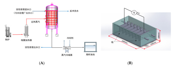 建造了一個(gè)用于微塑料去除實(shí)驗(yàn)的中試規(guī)模的設(shè)施,該設(shè)施由帶有熱再生系統(tǒng)的活性炭塔組成。該設(shè)備在接觸塔中運(yùn)行時(shí)的總質(zhì)量約為800千克活性炭。這個(gè)設(shè)施是由活性炭單元和過熱蒸汽單元組成的可熱再生裝置。該活性炭塔系統(tǒng)是在污水處理廠上建立的,收集污水樣本以進(jìn)行微塑料分析。如圖所示圖1A,蒸汽鍋爐中產(chǎn)生高于100℃的飽和蒸汽,并通過管線加熱器轉(zhuǎn)換為500-700°C的過熱蒸汽。蒸汽過熱進(jìn)行熱解過程,是由轉(zhuǎn)換后的過熱蒸汽通過塔內(nèi)的輻照管噴嘴在有效半徑內(nèi)噴灑到活性炭上,并提高了活性炭的溫度。通過噴灑500-700°C的過熱蒸汽來蒸發(fā)活性炭孔中的水分,并且通過無氧低溫將吸附的一氧化碳或二氧化碳和低分子量化合物與有機(jī)物和微塑料分解為水。此時(shí),將未分解的未溶解的低分子量有機(jī)化合物與冷凝水混合,并返回到污水處理廠的進(jìn)水口。從活性炭再生裝置下部排出的蒸汽由熱交換器冷卻,然后引入冷凝水儲(chǔ)罐,并返回到污水處理廠進(jìn)水或進(jìn)行后處理。