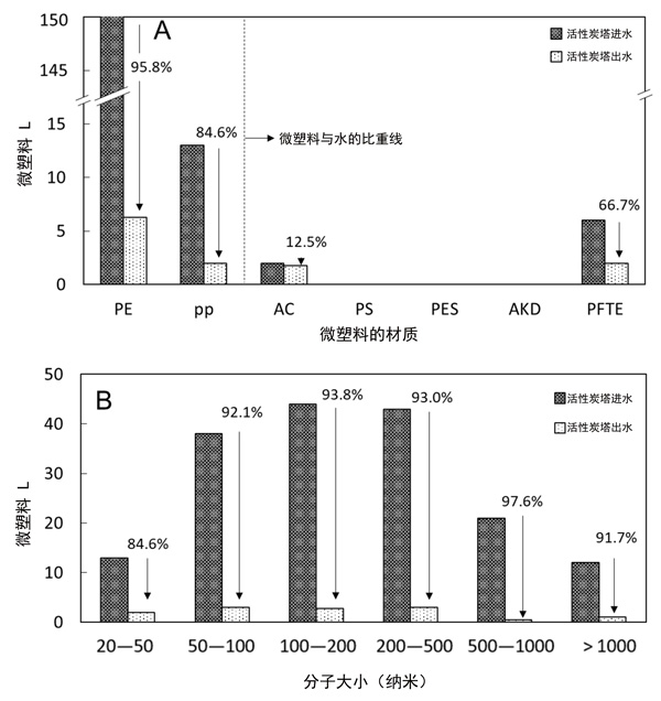 在污水處理廠的進(jìn)水和出水中觀察到未處理的污水樣品中觀察到七個(gè)不同的微塑料顆粒,包括聚乙烯(PE),聚丙烯(PP),丙烯酸酯(AC),聚苯乙烯(PS),聚酯(PES),醇酸樹脂(AKD)和聚四氟乙烯(PTFE)。PE是最豐富的MP材料類別,占MP顆?倲(shù)的72%,其次是PP(13%),AC(6%)和其他分?jǐn)?shù)相對(duì)較小的聚合物(1-4%)。假定樣品中微塑料材料類別的數(shù)量順序與原料的比重有關(guān)。具有較低比重的微塑料顆?梢酝ㄟ^從污水源沉降到污水處理廠的過程中,以較低的重力進(jìn)行更有效的輸送。在中試規(guī);钚蕴垦b置的進(jìn)水和出水中觀察到的MP顆粒的數(shù)量濃度和尺寸分布分別顯示在圖2AB中。通過活性炭處理,可以顯著提高微塑料的去除率(92.9%)。特別是,發(fā)現(xiàn)活性炭處理在去除比水輕的微塑料(例如PE和PP)以及所有尺寸范圍的微塑料(包括20–50µm尺寸)方面都是有利的,而初級(jí)和生物處理很少去除這些微塑料。關(guān)于微塑料去除效率,配備活性炭過濾系統(tǒng)的飲用水處理廠獲得了類似的結(jié)果(大約89%的去除率)。